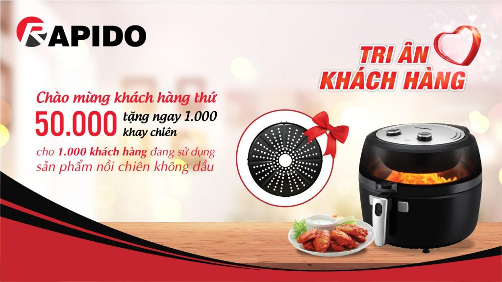 Để cảm ơn sự tin dùng và chào mừng khách hàng thứ 50.000 sử dụng sản phẩm NỒI CHIÊN KHÔNG DẦU, Rapido xin gửi tới Quý khách hàng chương trình “Tri ân khách hàng” vô cùng hấp dẫn.